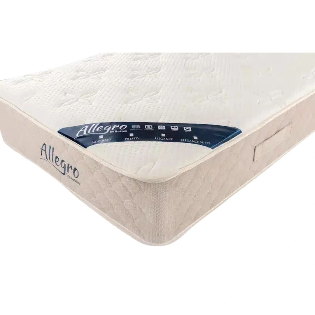 Az Allegro Presto táskarugós matrac a Vivo modellnél egy fokkal keményebb, 4-es komfortjelölésű, közepesen kemény matrac. A 26 cm vastagságú kialakítás alapját egy 13 cm magas, német minőségű, edzett, 5 zónás táskarugós rendszer adja, amely stabil alátámasztást és kiegyensúlyozott ergonómiát biztosít.