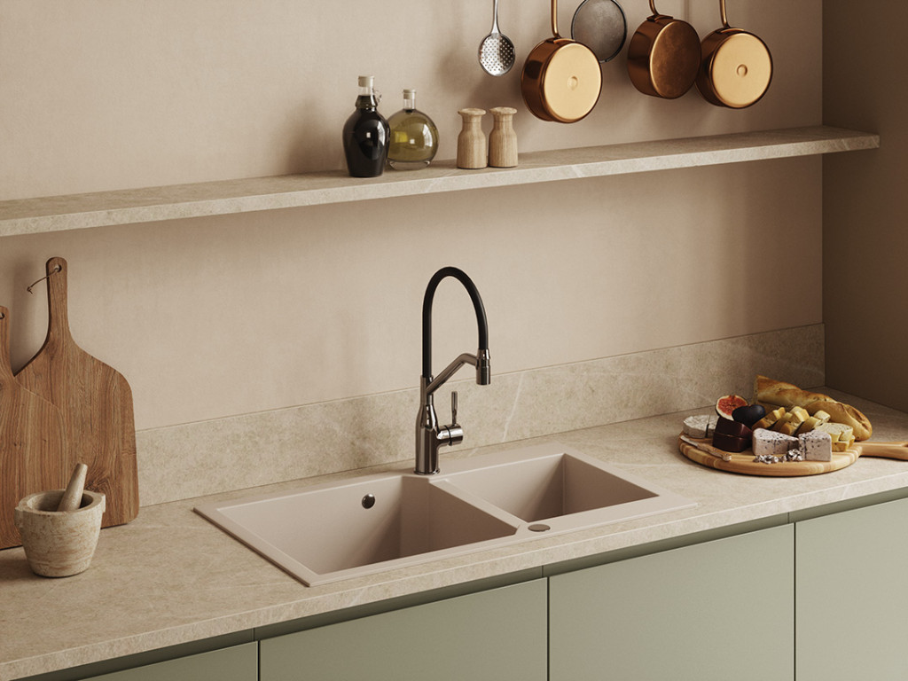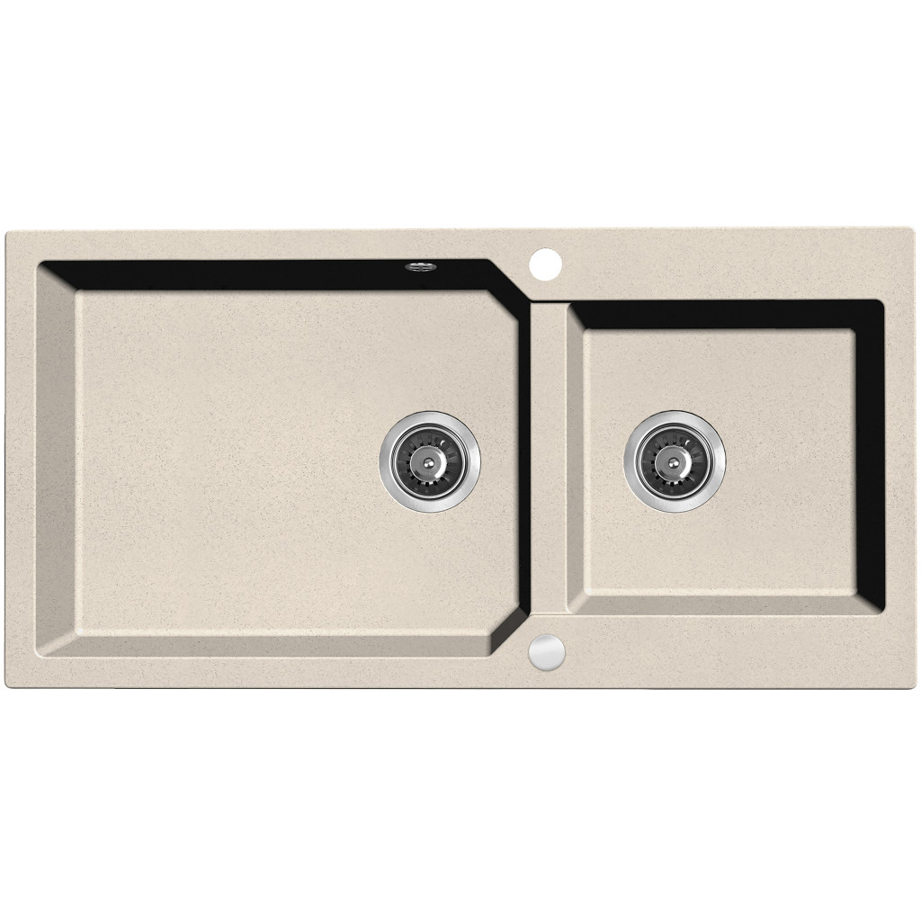 Laveo MILOS 2M 100 kétmedencés bézs gránit mosogató helytakarékos dugókiemelős szifonnal