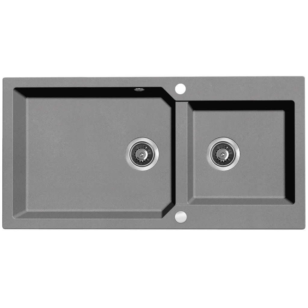 Laveo MILOS 2M 100 kétmedencés szürke gránit mosogató helytakarékos dugókiemelős szifonnal