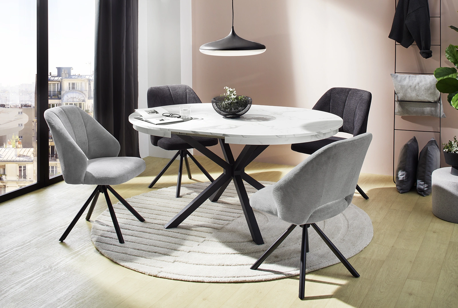 Ez az étkezőasztal nemcsak praktikus megoldást kínál, hanem a tér meghatározó elemeként emeli az otthon hangulatát is.