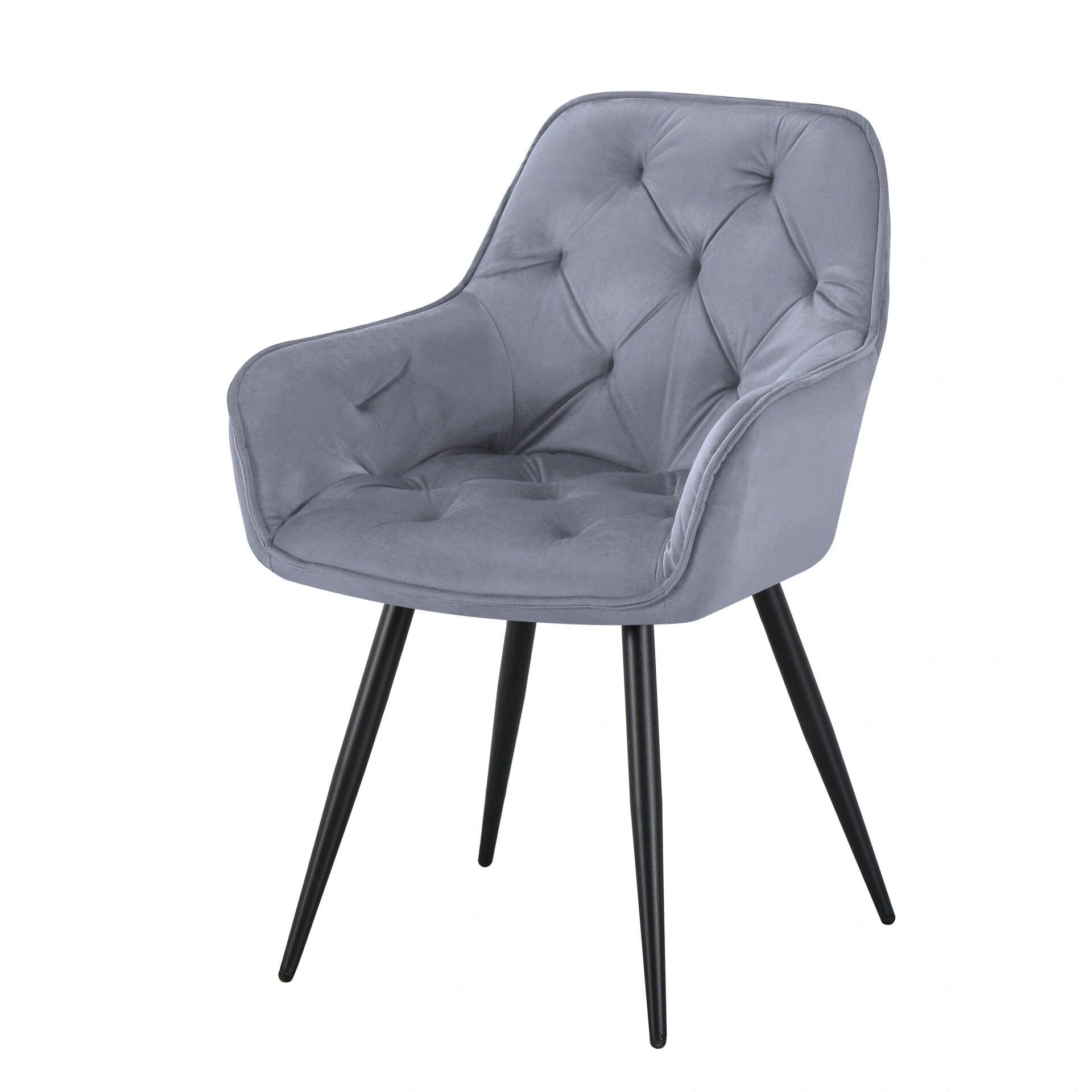 Modern, ugyanakkor elegáns étkezőszék szürke bársonyhuzattal és fekete fém lábakkal. Kényelmes, karfás kialakításának köszönhetően étkezőbe, tárgyalóba vagy nappaliba is ideális.