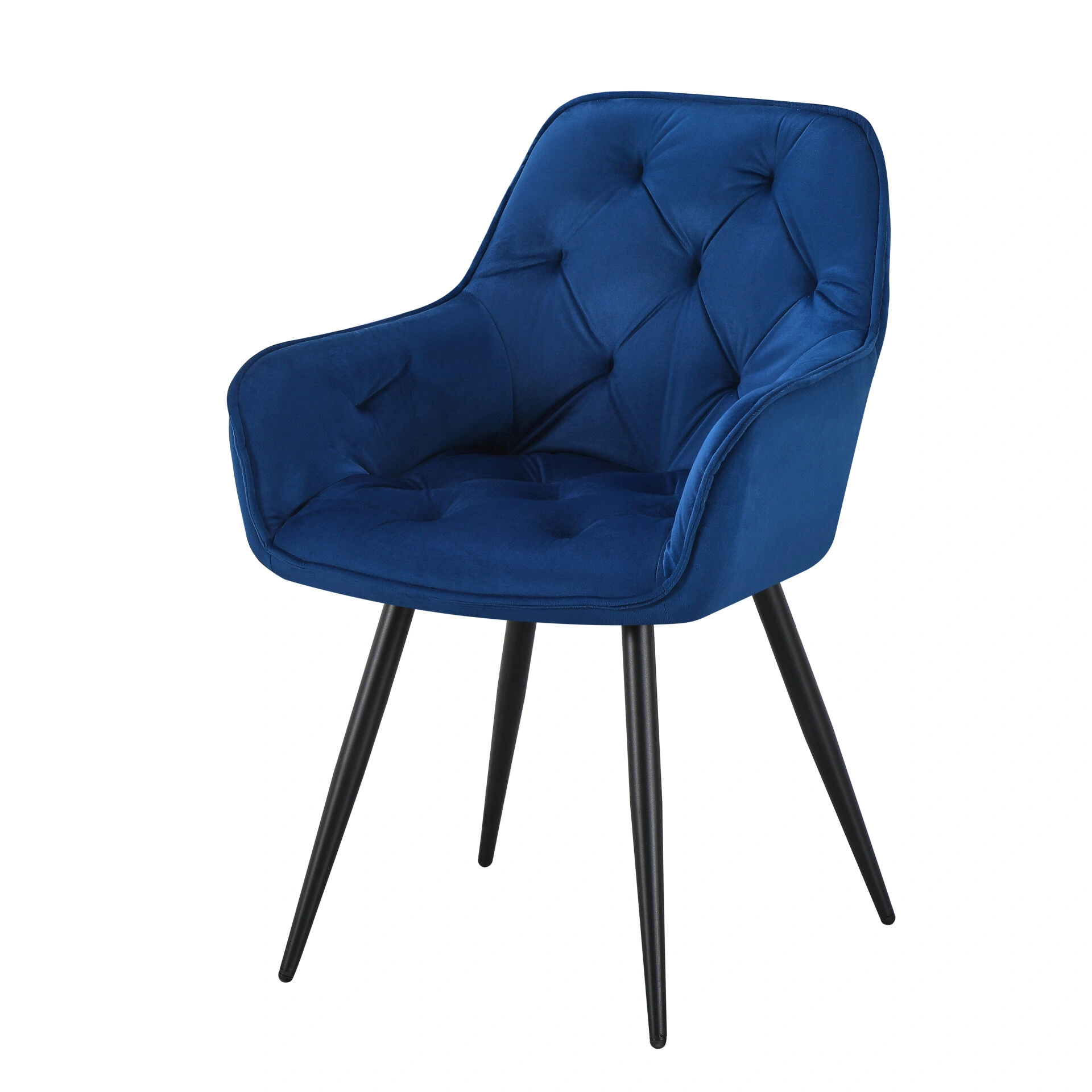 Stílusos étkezőszék elegáns kék bársonyhuzattal és fekete fém lábakkal. Kényelmes karfás kialakítása és látványos steppelt háttámlája igazi karaktert ad a térnek.